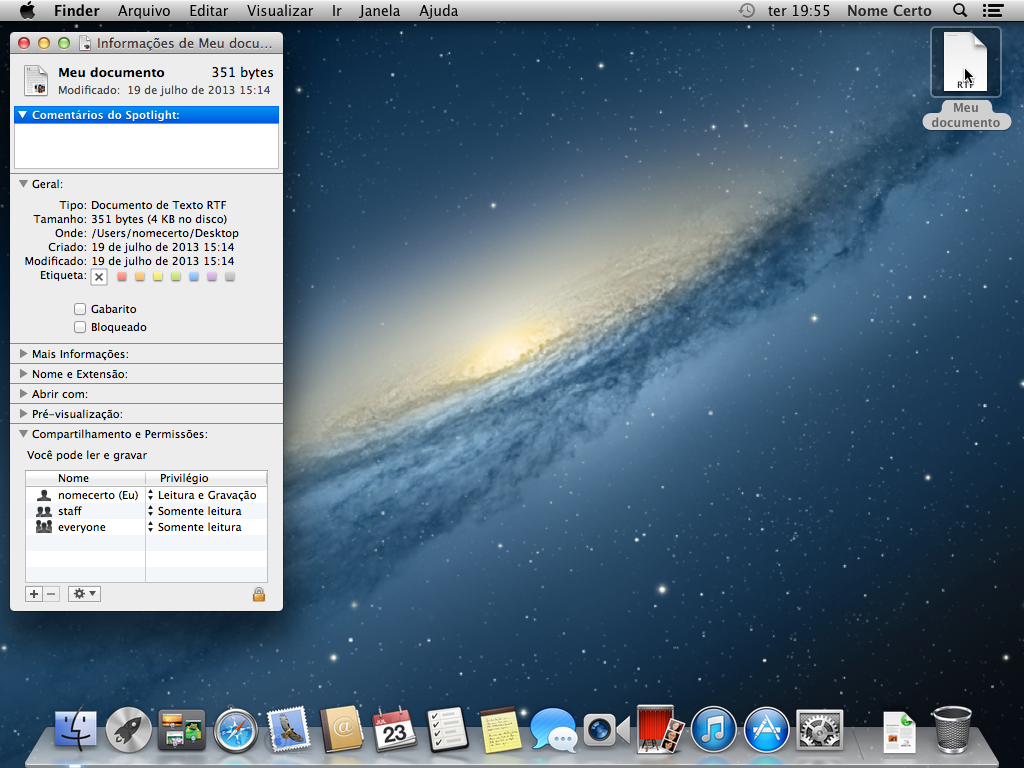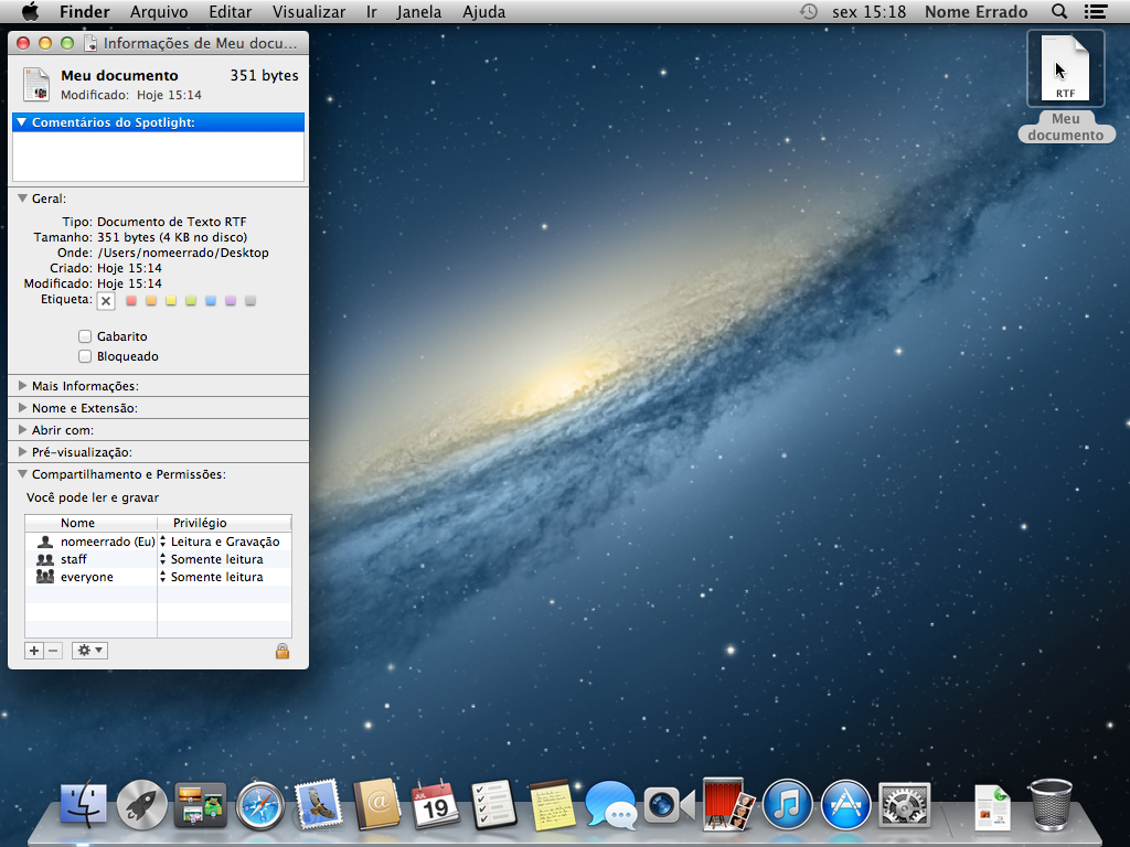Para acompanhar o que vai acontecer criei um documento de texto na mesa deste usuário e pedi a janela de informações do Finder onde podemos ver quem é o dono do arquivo (nomeerrado (Eu))