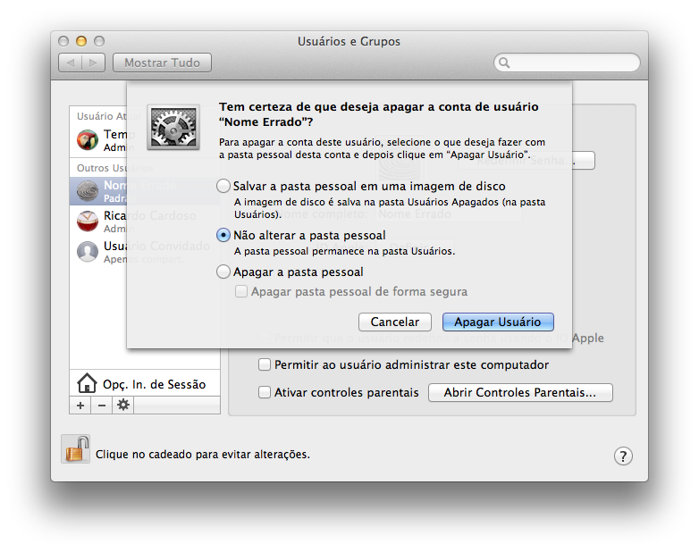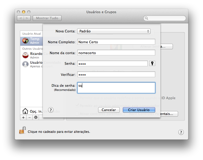 Crie um usuário com o nome de conta exatamente igual ao nome dado na pasta, no meu caso “nomecerto”. Pode ser Padrão ou Administrador, não precisa ser igual ao usuário anterior. Use a mesma senha do usuário anterior para evitar problemas com as Chaves (Keychain) do Mac OS X, depois que estiver com o nome do usuário trocado você poderá trocar a senha.
