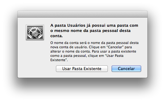 Quando clicar em “Criar Usuário” verá uma janela perguntando se quer “Usar Pasta Existente” ou “Cancelar”, selecione “Usar Pasta Existente”.