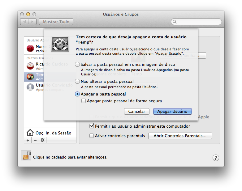 Selecione o usuário “Temp” e clique em “-” para apagar o usuário, desta vez escolha a terceira opção, para apagar imediatamente. Como era um usuário temporário não precisamos guardar nenhum arquivo dele.